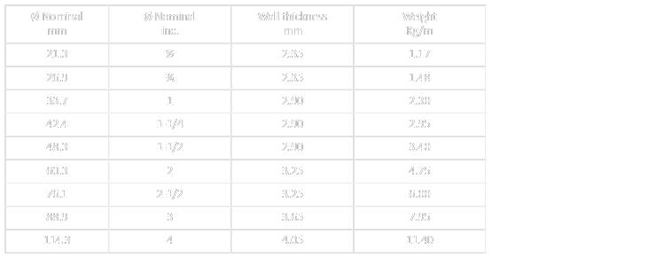 The tubes are produced according to the UNI 7683 standard, in unalloyed carbon steel, longitudinally welded, hot dip galvanized and with UNI 6125 tapered gas threading at the ends. Each pipe is equipped with a UNI 7684 threaded socket.